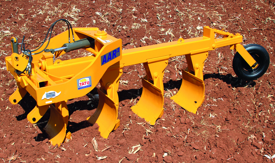 Estrutura moderna, extra resistente, com melhor distribuição de peso. Sistema de Reversão Horizontal: com apenas um conjunto de aivecas, a reversão é rápida e simples, através de um cilindro hidráulico de dupla ação. O cabeçalho de engate aos três pontos é pivotado junto à estrutura do arado e assistido por um cilindro que efetua o nivelamento automático das aivecas nos dois sentidos de aração. A válvula de retenção pilotada do sistema hidráulico mantém o conjunto firmemente travado na posição desejada.